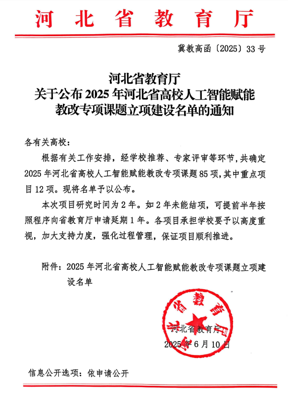 日前,河北省教育厅发布了《河北省教育厅关于公布2025年河北省高校人工智能赋能教改专项课题立项建设名单的通知》(冀教高函〔2025〕33号),公司张瑞锋老师申报的课题《生成式教育智能体赋能通识课程实践研究:以《Python语言基础》为例》获批立项。