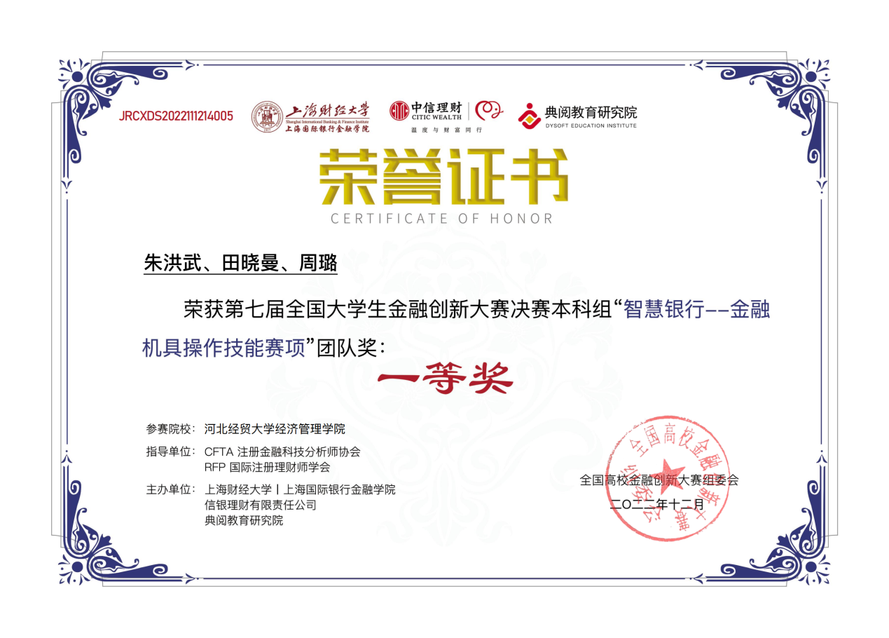 202211月由上海财经大学、上海国际银行金融学院、中信集团-信银理财、典阅教育研究院主办的第七届全国老员工金融创新大赛圆满落幕。公司经济系首次组队参赛,周璐、朱洪武、田晓曼同学荣获智慧银行银行-金融机具操作技能赛项团体一等奖、满昱泽、李佳梦、杨傲然、韩荣鑫、李诺、张佳慧荣获银行核心业务六大岗位职业能力赛项团体三等奖。郑庆国、贾红玉老师被评选为优秀指导老师。