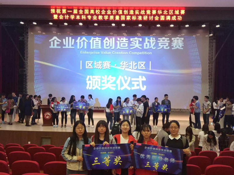 5月6日,第一届全国高校企业价值创造实战竞赛(EVC大赛)华北区域赛决赛在首都经济贸易大学举行。管理系王丽君老师带领由该系2016级人力资源管理一班王旭蕊、任晨曦、刘芯秀、王明辉等四名同学组成的参赛队伍代表学院,与来自华北地区48所高校的参赛队伍同台竞技,最终荣获大赛三等奖。