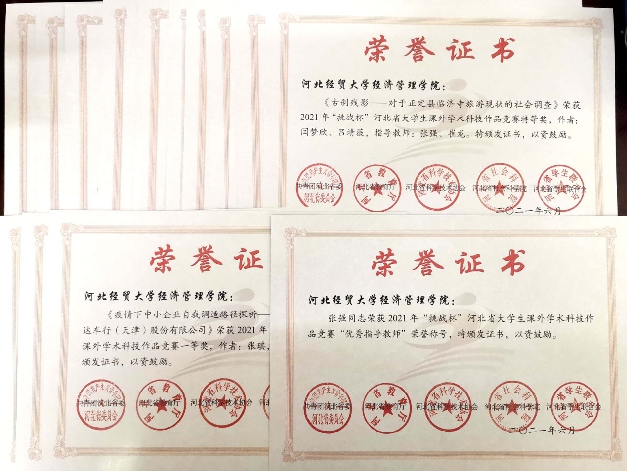 本届大赛自今年二月份启动以来,通过校内层层选拔,经过大赛评审委员会的初评、复评,以及终审答辩,公司报送的作品在全省1642件作品中脱颖而出,共有16项获奖。其中,《古刹残影对于正定县临济寺旅游现状的社会调查》获得特等奖。《疫情下中小企业自我调适路径探析———阿里巴巴国家站与易路达车行(天津)股份有限公司》等3个项目获得一等奖,《本科生学业增负的必要性以及策略研究——以河北省高校为例》获得二等奖,《短视频等自媒体文化的思考》等11个项目获得三等奖。这些奖项的获得充分展示了公司人才培养水平。公司团委全面、高效、系统的组织工作也受到了赛事组委会的充分认可,最终被授予优秀组织单位奖。公司教师张强还获得优秀指导教师荣誉称号。