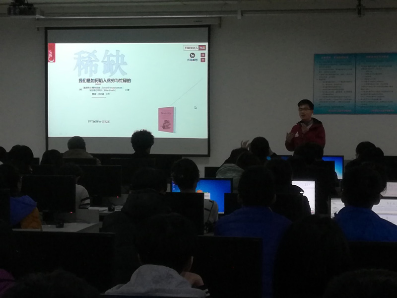 本次分享活动邀请到的四位商务系同学分别是2015级孔德峰同学、陈志诚同学和2016级的蒋蕴滦同学和尹子源同学,他们分别使用PPT与大家分享了塞德希尔的《稀缺》、《大败局》《科学管理原理》、《带着爱心去工作》四部书。其中《稀缺》一书,孔德丰同学从“我们是如何陷入贫困和忙碌”的主题展开,分析原因,从而让同学们认识到应该如何规划好时间,提高学习效率;而陈志诚同学则通过阅读《大败局》一书,从史玉柱“投资巨人大厦导致资金链断裂而几乎破产”的历史教训到“健力宝”之父李经纬的陨落两个经典案例中,领悟到了中国企业的“中国式失败”的原因,对如何做好一个工商管理人应该具备的素质有了明确的认识。另外两位同学也都向同学们介绍了自己通过读书获得得满满的收获。