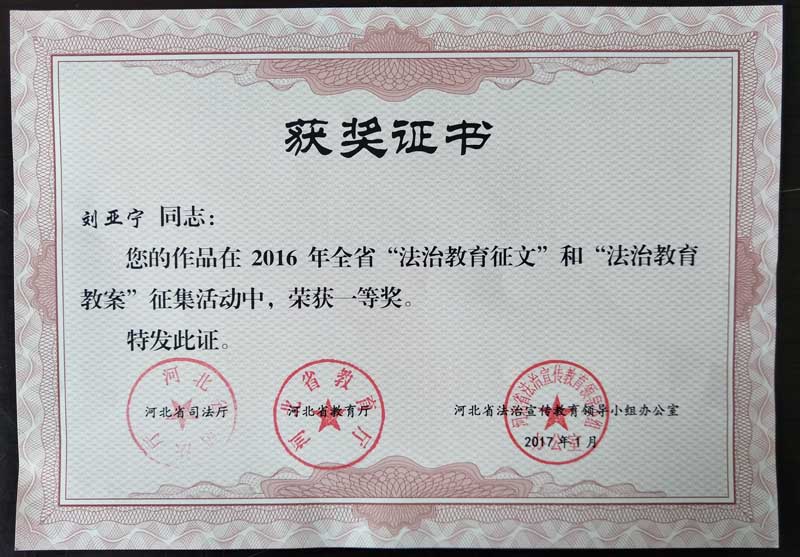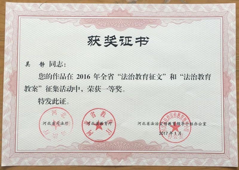 近日,2016年全省“法治教育征文”和“法治教育教案”评选结果揭晓,公司获得优秀组织奖,公司辅导员吴静、刘亚宁荣获大学组征文一等奖。