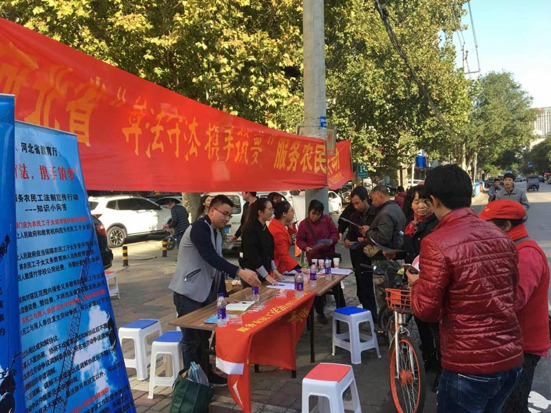 10月30日下午,由河北省总工会组织的河北省“尊法守法,携手筑梦”服务进城务工人员法制宣传活动在石家庄市少年活动中心广场举行。公司商务系赵云岩老师、文法系马天齐老师带领学院员工志愿者们参加活动。