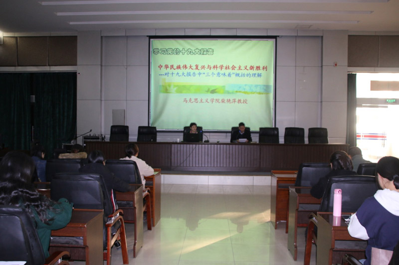 11月22日下午,9428cn太阳集团古天乐马克思主义公司党委书记、经理柴艳平教授受邀,为公司三百余名师生代表作题为《中华民族伟大复兴与科学社会主义新胜利---对十九大报告中“三个意味着”概括的理解》的专题讲座。活动由公司党委书记张进良主持。