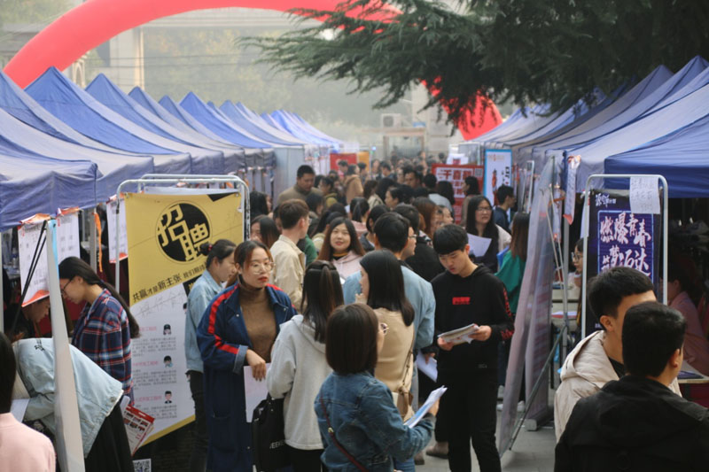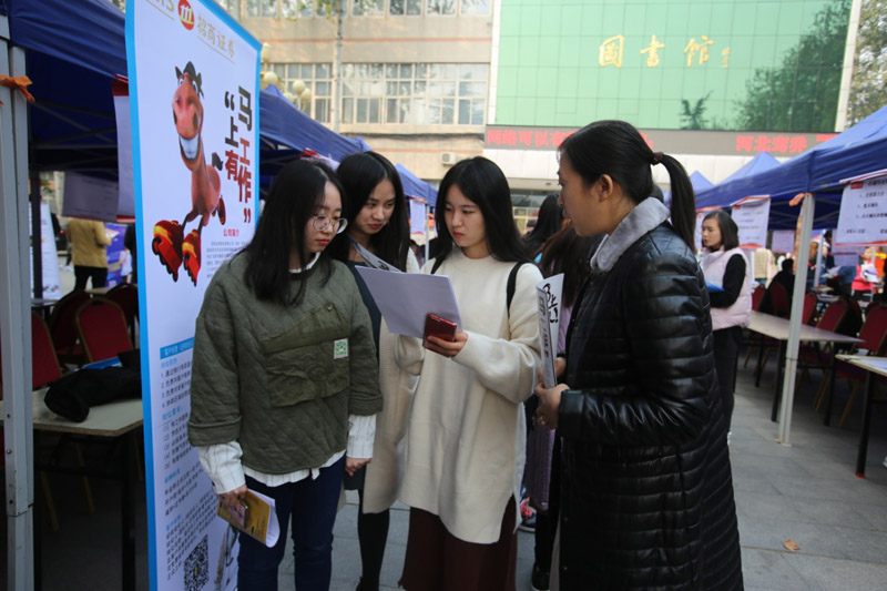 11月2日,公司2019届毕业生首场校园双选会在学院图书馆广场举行。双选会邀请到石家庄英孚培训学校、孩子王儿童用品有限公司、河北源达证券股份有限公司、中国太平人寿、新天际教育集团、千喜鹤股份有限公司等300多家知名企业,提供就业岗位4200余个。