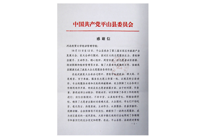 10月11日至12日石家庄市第三届旅游发展大会在平山县举行,接到平山县团委的请求,公司派出100余名志愿者分赴西柏坡游客中心、富力健康养生城、泓润生态园三个核心片区开展志愿服务活动,期间他们在岗前拉练、接待引导等工作中表现积极突出,得到主办方的一致好评,其中29名同学被团市委授予“优秀志愿者”荣誉称号。中共平山县委及平山县政府特别写来感谢信对学院在志愿者招募、培训保障、组织管理等方面的主动作为和精心安排表示衷心地感谢。
