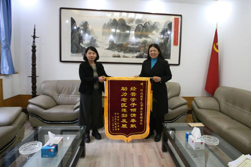 11月13日下午,平山县团委副书记王秋静代表平山县团委将一面“经管学子倾情奉献助力老区蓬勃发展”的锦旗送到公司党委副书记张丽英手中,对10月中旬公司志愿者在石家庄市第三届旅游发展大会中给予的支持和帮助表示感谢,同时将平山县委县政府的一封感谢信送到公司党委书记张进良手中。