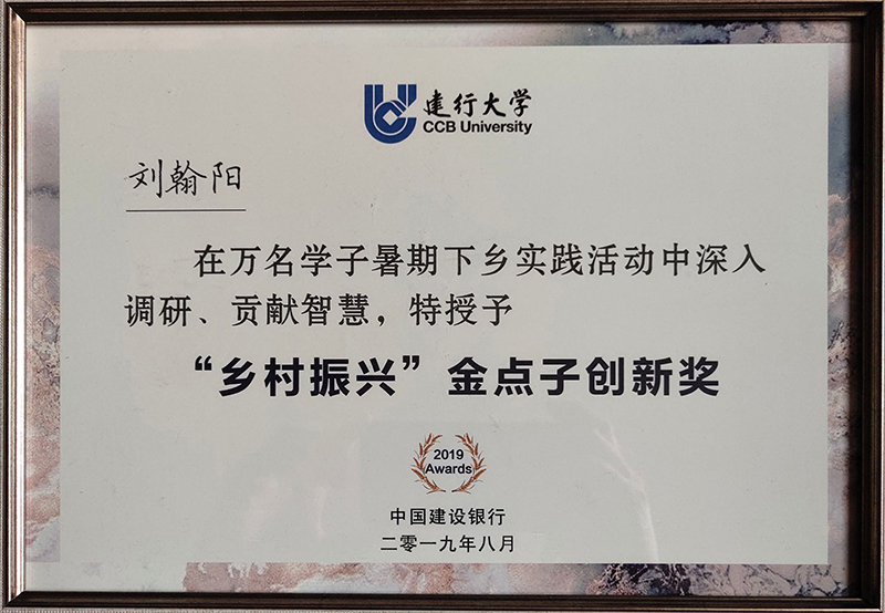公司经济系16级金融6班的刘翰阳同学参加了实践活动。他在深入阜平县农村地区开展实践调研的过程中,努力将金融知识、金融服务、专业技能传递到村民家中,帮助村民做一些力所能及的事,获得了村民的一致肯定。在建设银行阜平支行陈子达行长和班主任韩璐老师的指导下,刘翰阳同学撰写的《阜平县关于精准扶贫及金融科技振兴乡村的研究》社会实践报告,结合了阜平地区近年来的变化以及下乡实践获得的真实数据,对该地区的现状以及贫困原因进行了客观的分析,详细论证了如何将金融和科技这两个脱贫关键力量注入到贫困地区,并且提出了创新性的建议。其实践报告获得了河北省建设银行颁发的优秀征文奖,实践报告中提出的“金点子”建议,获得了中国建设银行总行颁发的“金点子创新奖”。