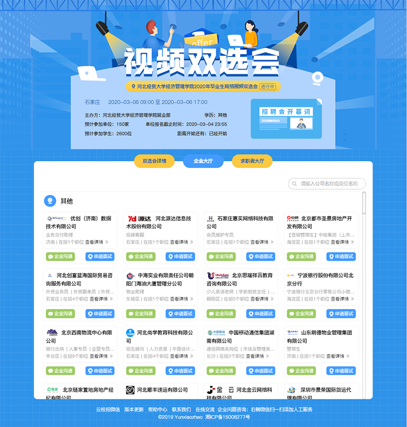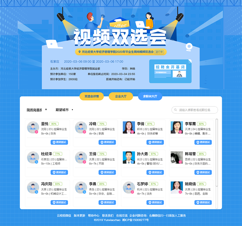 为减少疫情对毕业生就业工作的影响,增强毕业生求职和用人单位招聘的有效性、针对性,促进公司毕业生更充分和更高质量就业。3月6日,公司成功举办2020届毕业生云就业网络视频双选会。