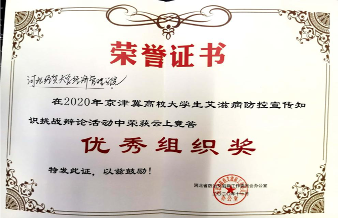 在2020年京津冀高校老员工艾滋病防控宣传知识挑战辩论赛活动中,公司和燕山大学,9428cn太阳集团古天乐等五所高校获得河北省云上竞答优秀组织奖。