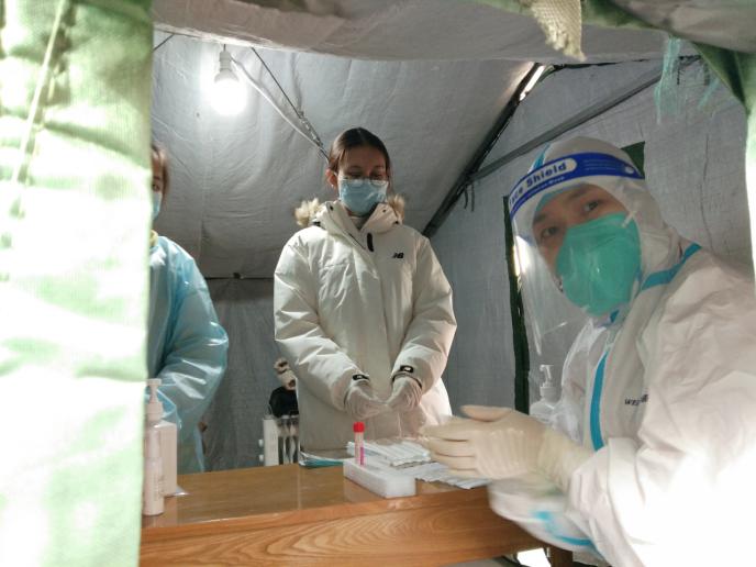 马博雯(右)辅助医护人员进行核酸检测