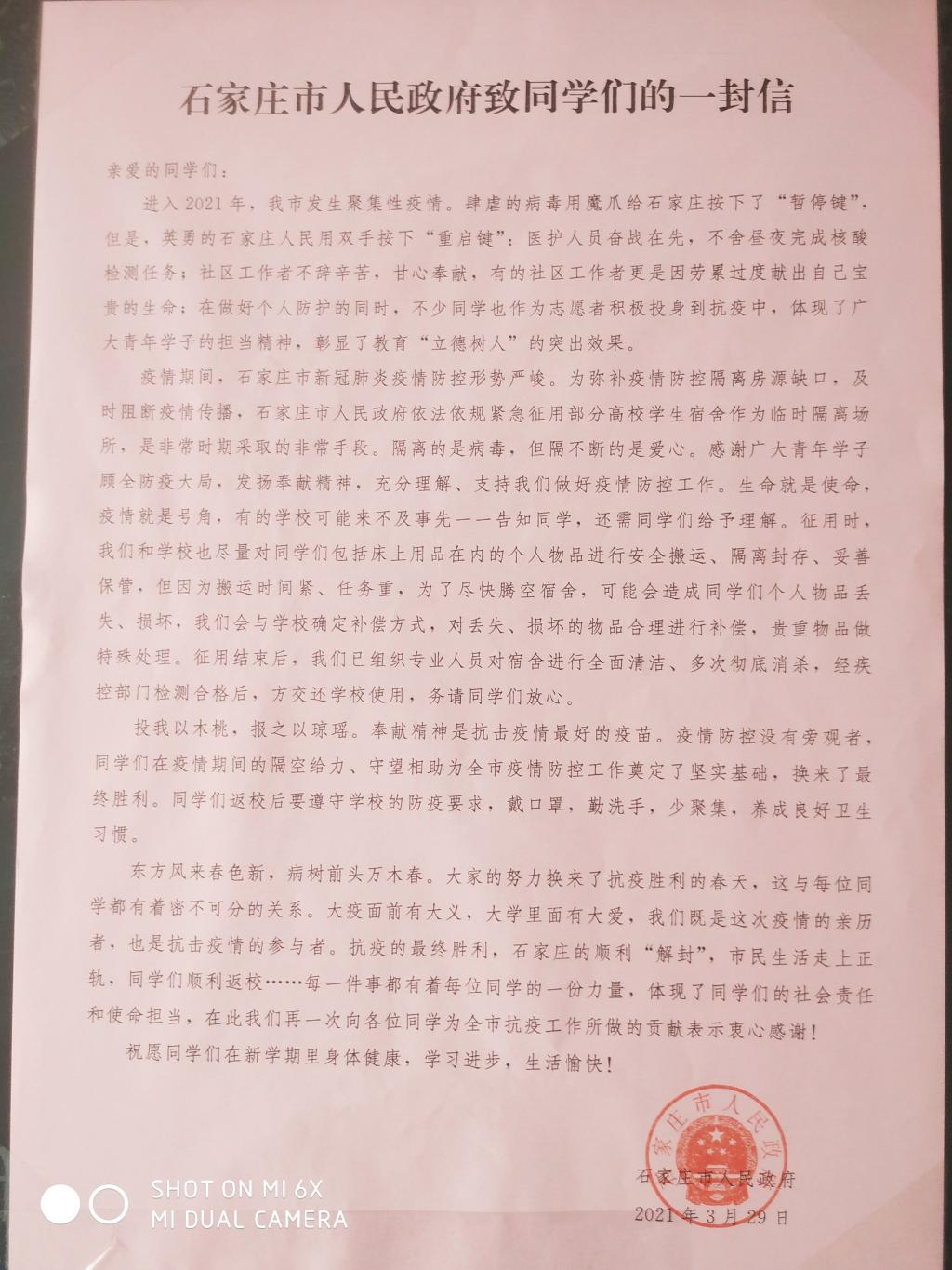 会上,员工工作部老师杨斌还宣读了石家庄市人民政府致同学们的感谢信。( 撰稿\摄影:姜瑞 )
