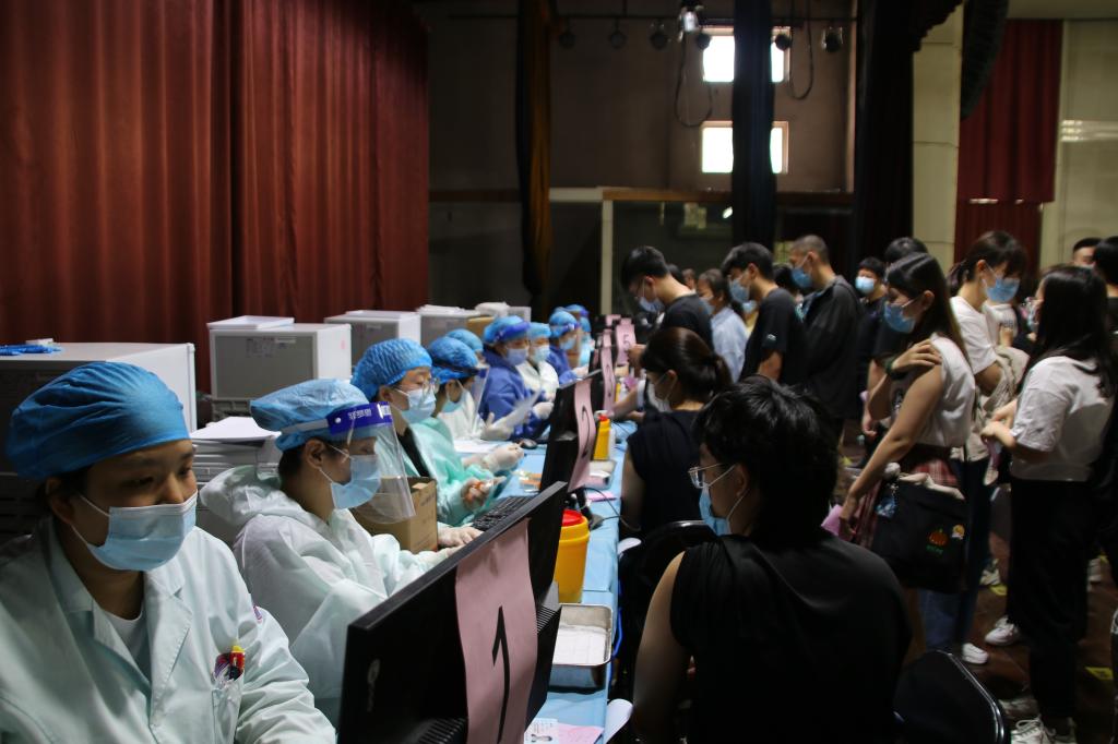 接种期间,学院疫苗接种工作负责领导刘翼莲带领南校区校医院经理陈娟及全体医务人员始终坚守一线。校医院、学院办公室、安全工作部等相关部门分工协作,和学院50余名员工志愿者组成现场保障团队,负责物资调配、人员安排、秩序维护等工作,确保公司疫苗接种工作迅速有序、安全高效开展。