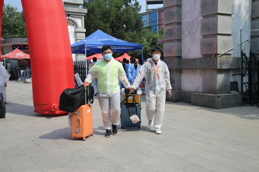 公司在火车站设立了接站点,志愿者身着防护服,迎接出站新生。报到现场开设新生入校通道和行李通道,新生们在入校通道经过测温、出示健康码和行程卡、人脸识别等流程后进入校园,经过抗原试剂检测、核酸检测后再由各系志愿者引导新生完成报到流程。他们的行李则由员工会志愿者全部酒精消毒后,通过行李通道放置于行李寄存处,待新生完成报到流程后,再由各系志愿者“一对一”搬运行李送达宿舍,搬运过程中志愿者们边走边介绍校园环境和生活经验,为新生们引路答疑。疫情防控,家长们虽然没能进入校门,但看到志愿者们热情暖心的服务,他们终于放下了那颗颗悬着的心。