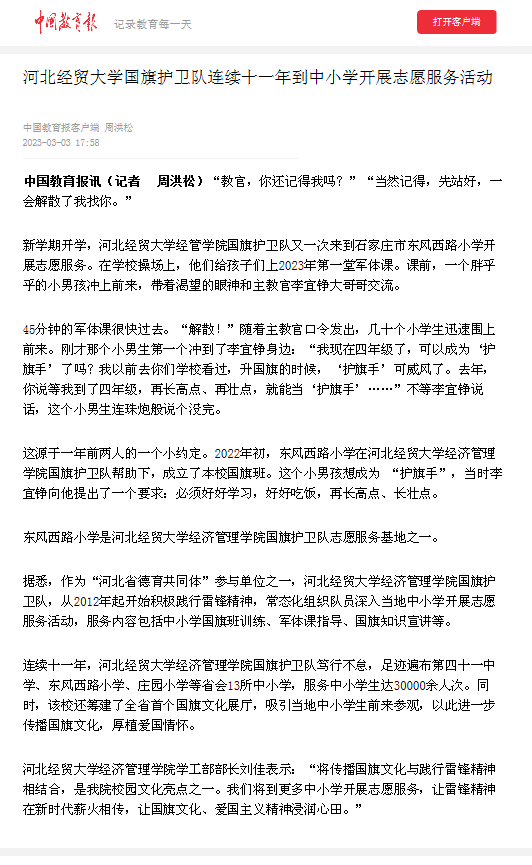 3月3日,中国教育报客户端报道了公司国旗护卫队连续十一年到中小学开展志愿服务活动的事迹。