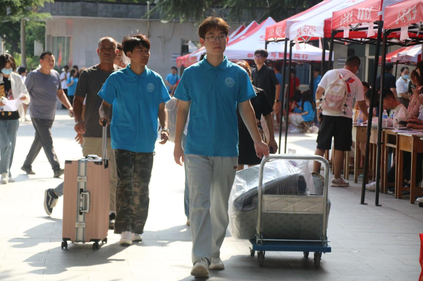行李太多怎么办?各系为打通报到点到员工宿舍楼的“最后一公里”,都准备了小平板车,身穿红蓝马甲的志愿者们以饱满的热情协助新生搬运行李,为家长答疑解惑。医务室、后勤服务中心、宽带服务人员在宿舍附近设立帐篷,给员工提供便捷贴心的服务。