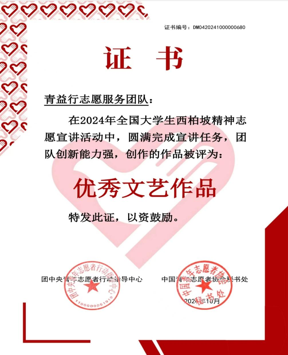 10 月 12 日,公司“青益行”志愿服务团队创作的作品被团中央青年志愿者行动指导中心评为“优秀文艺作品”,这一荣誉是对“青益行”志愿服务团队不懈努力的高度认可。