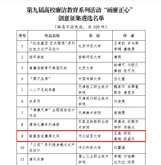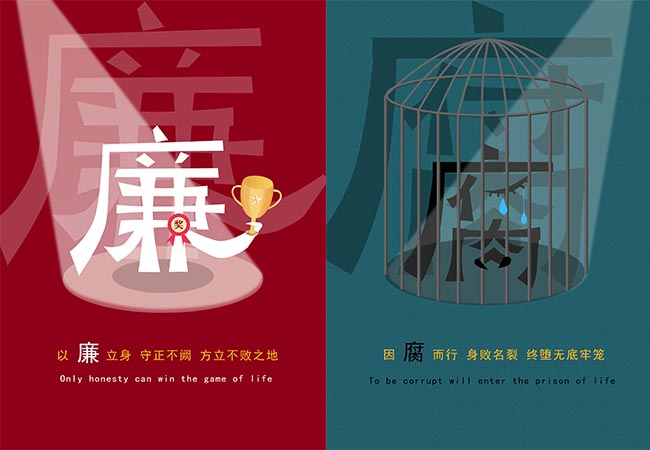 《输赢皆在廉腐之间》由文法系2022级新闻2班王晶设计,党委宣传部郑廷、大学宣传部姜瑞、段盛杰指导,该设计作品运用对比和拟人的手法,将“廉”与“腐”二字刻画成“获奖者”和“入狱者”的形象,反腐倡廉的主题跃然纸上,作品旨在倡导崇廉拒腐的社会风气,传递出积极向上的价值观。高校廉洁教育系列活动知识问答全国仅有100名员工上榜,公司商务系2022级电子商务2班员工穆俊丽以优异的成绩入选。