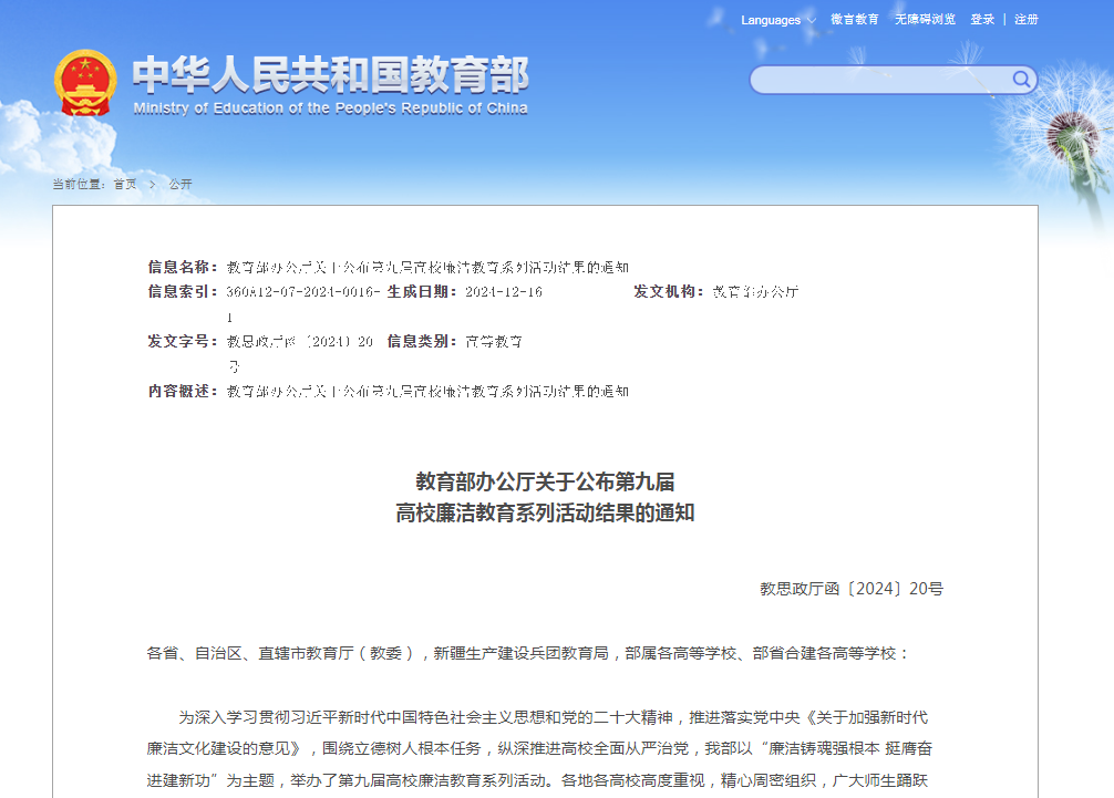 近日,教育部办公厅公布第九届高校廉洁教育系列活动结果。公司通过廉洁文化月活动征集并选送的作品《输赢皆在廉腐之间》入选系列活动“画廉正心”创意征集遴选名单;穆俊丽入选系列活动知识问答优秀学员名单。