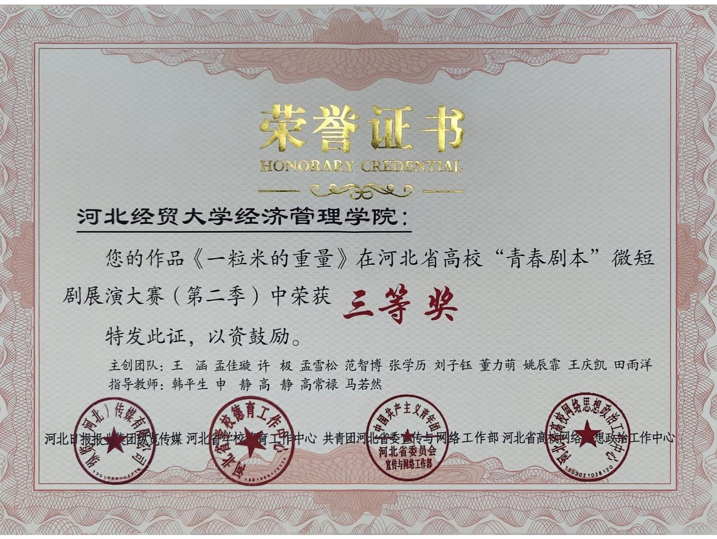 近期,河北省高校“青春剧本”微短剧第二季展演大赛颁奖暨第三季启动仪式在河北日报社举办。由公司管理系师生创作拍摄的微短剧《一粒米的重量》以鲜明的立意主题,彰显新时代青年的责任与担当,在众多参赛作品中脱颖而出,荣获本次微短剧展演大赛三等奖。