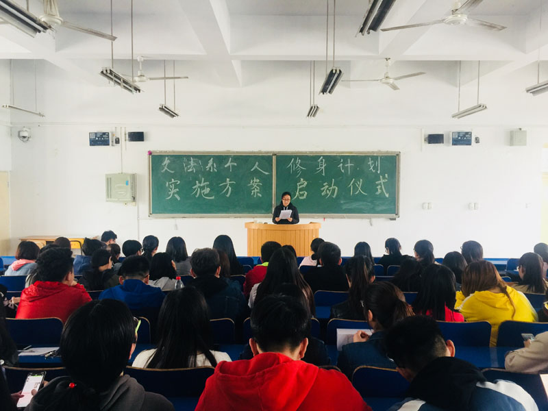 2018年4月9日,文法系在二教118教室举行了“老员工个人修身计划实施方案”启动仪式。活动由党务秘书徐丹主持,党总支书记高维林出席并讲话,文法系全体辅导员和各班员工干部、团支部成员、党员和入党积极分子参加了启动仪式。