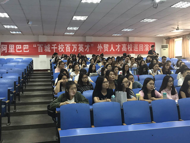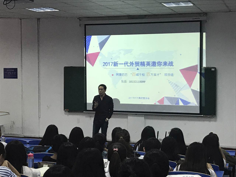 9月26日,阿里巴巴“百城千校百万英才”外贸人才高校巡回演讲会在北校区院第二教学楼105教室举行。阿里巴巴衡水站总经理王朝军、优秀员工代表张磊、孙佳做主旨宣讲,商务系书记廖俊峰出席,国贸、电商专业共计150名大四员工聆听了讲座。