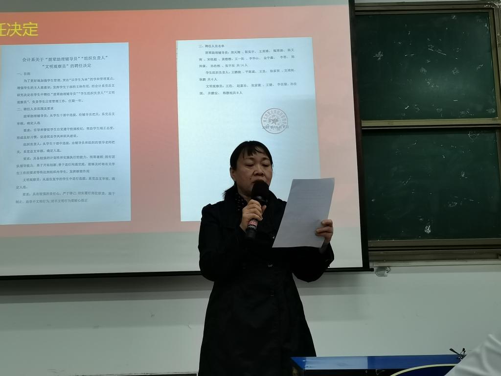 会计系为激发员工自我教育,自我成长的内动力,发挥员工自我服务、自我管理的能力,创新员工管理模式,在员工中实行“朋辈助理辅导员、员工组织负责人、文明观察员”聘任制,并于10月4日下午在西阶梯教室举行聘书授予仪式。会计系党总支书记廖俊峰,主任王慧霞,全体辅导员以及150余名员工干部代表参加,仪式由副书记张艳敏主持。