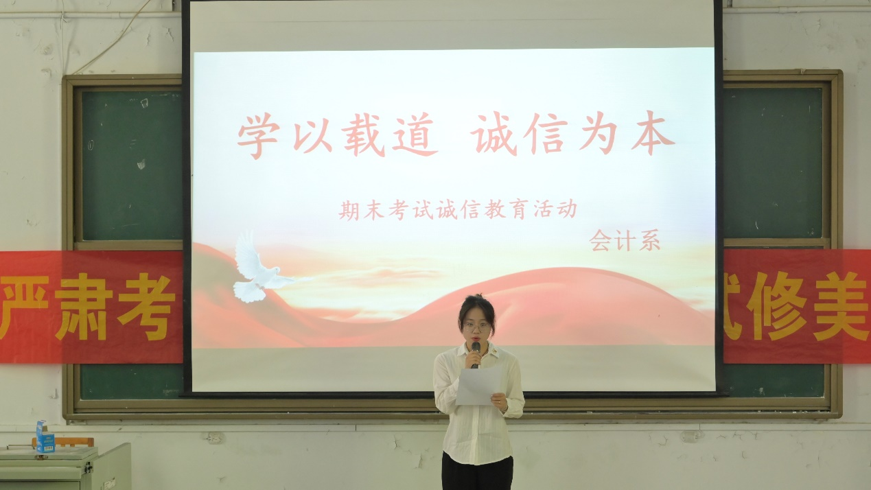 为进一步加强学风建设,增强诚信应考意识,严肃考风考纪。会计系自6月份以来通过召开各班诚信考试主题班会,各班同学签写诚信考试承诺书开展“学以载道,诚信为本”期末考试诚信教育系列活动,诚信教育是员工思想政治教育的重要组成部分,会计系历年来高度重视对员工的诚信教育,以实际行动践行社会主义核心价值观,认真落实立德树人根本任务。为强化活动质量,系部于 6月17日在西阶梯召开诚信教育再深化活动,会计系党委副书记张艳敏、团总支书记陈江伟、全体辅导员及各班员工代表260余人参加,教务秘书邓怀宇主持。