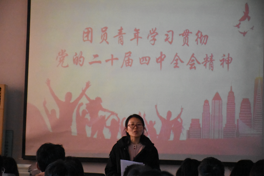 申静以“深入领会党的二十届四中全会精神,贯彻落实核心要义”为主题进行宣讲。她强调,全体团员要深刻理解全会精神,坚定理想信念,明确历史责任,使个人成长始终与党和国家事业发展同频共振,为强国建设、民族复兴贡献青春力量。她指出,全会提出的各项任务都与团员密切相关,专业学习和社会实践都是青年对接国家需求、实现价值的重要途径。她鼓励大家既要“读万卷书”,夯实专业本领;也要“行万里路”,在基层锻炼中担当尽责,在中国式现代化的实践中书写青春篇章。