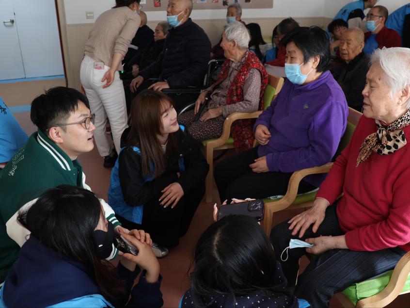 活动现场秩序井然,在养老院工作人员的安排下,同学们迅速分组、分工协作,围坐在老人身边,耐心询问饮食起居与身体状况,认真倾听老人讲述过往经历与生活趣事,用陪伴拉近与老人的距离。随后,志愿者们为老人带来精心准备的歌曲演唱节目,演唱经典老歌,与老人互动合唱,丰富老人的精神文化生活。
