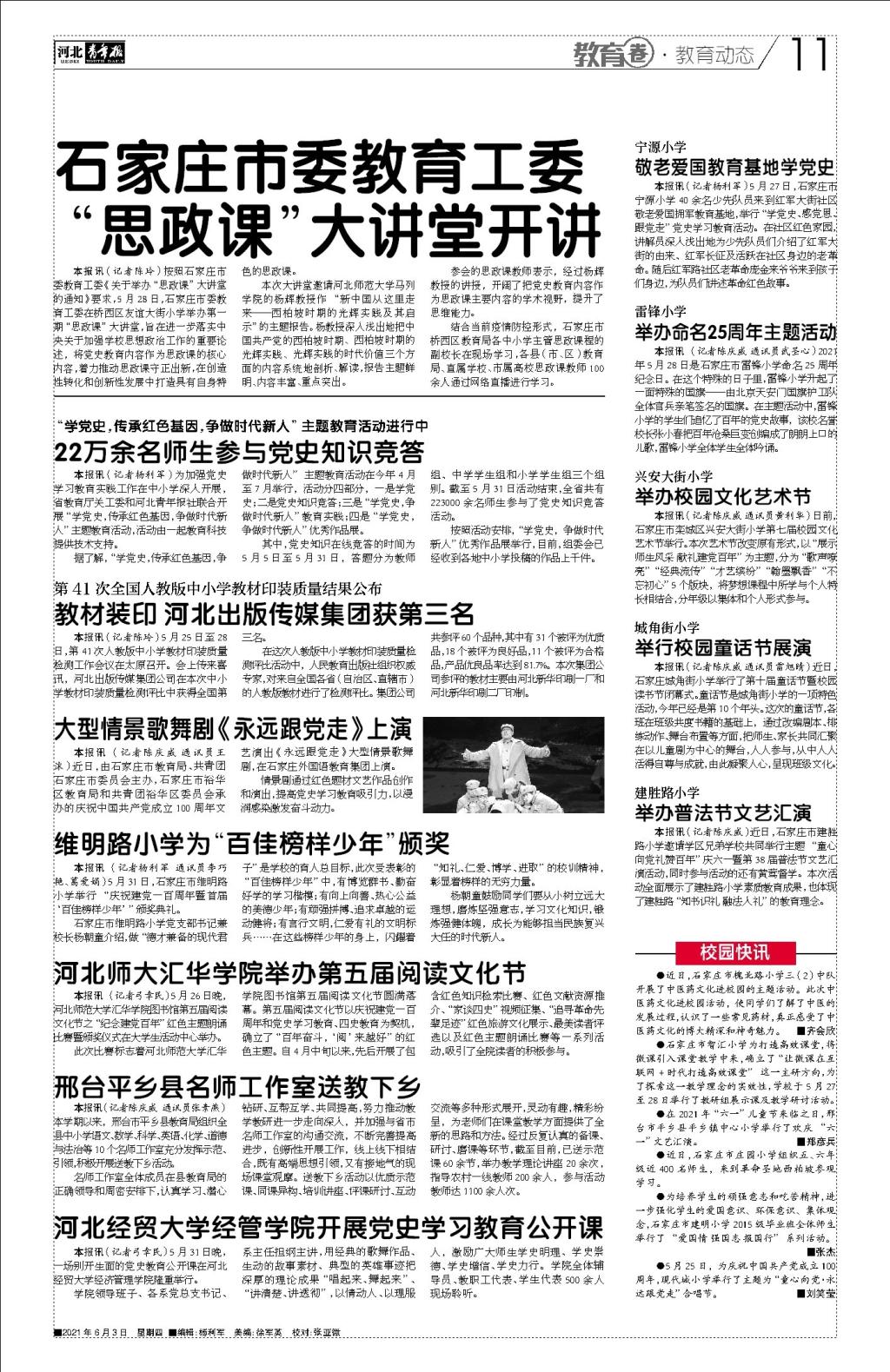 5月31日,公司隆重举行“庆祝中国共产党成立100周年”主题公开课,中国教育网、河北日报、河北教育网、河北电视台冀时客户端、长城网、共产党员网、河北电台综合频率、河北青年报等多家有影响力的媒体争相进行报道,今日头条、封面、人民资讯等多家网络媒体转发。