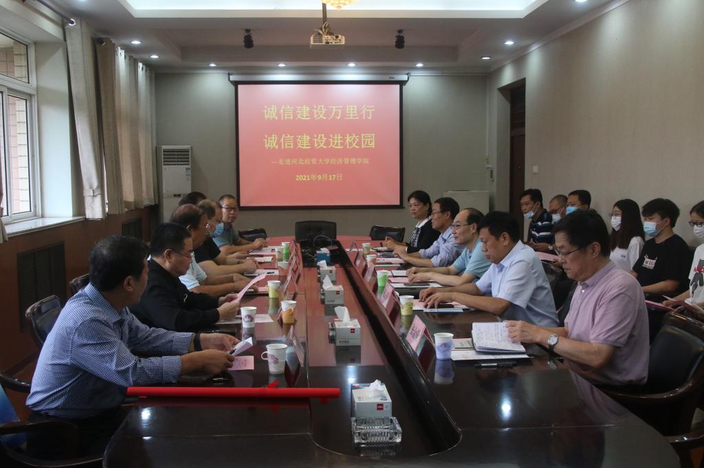 9月17日下午,由河北省诚信协会举办的“诚信建设万里行”——诚信建设进校园活动在公司举行。河北省社会信用体系建设领导小组办公室二级调研员张帅,省信用协会顾问委员会主任、原省工商局巡视员孙芳,省工商联副主席、省信用协会会长、天山实业集团董事局主席吴振山,省信用协会执行会长、书记白建军,省信用协会创业就业专业委员会秘书长、河北华一智慧城市科技有限公司总经理丁江涛,与学院领导马斌、张进良、江秀军、张金桐、张丽英共同出席活动。