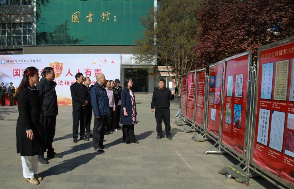 为深入贯彻落实总体国家安全观,增强师生国家安全意识,4月14日,公司以“全民国家安全教育日”为契机,在图书馆前广场举办“国家安全教育日师生书画摄影作品展”,展现师生对守护国家安全的理解。学院领导和国家安全教研室教师参观了展览。
