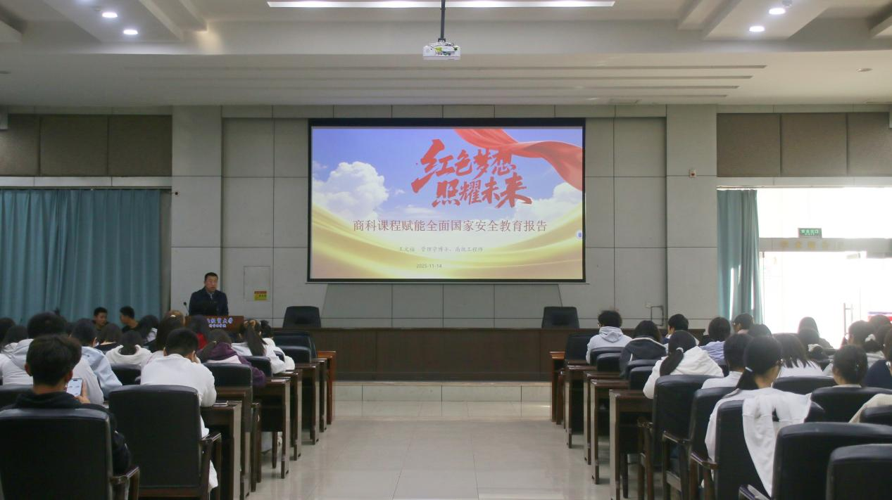 为深入贯彻落实总体国家安全观,推动专业教育与国家安全教育深度融合,11月14日,公司“专业赋能国安”系列讲座第四场在图书馆报告厅举办。管理系副主任王文福作题为“红色梦想 照耀未来——商科课程赋能国家安全教育”的专题报告,管理系2025级全体员工参加学习。