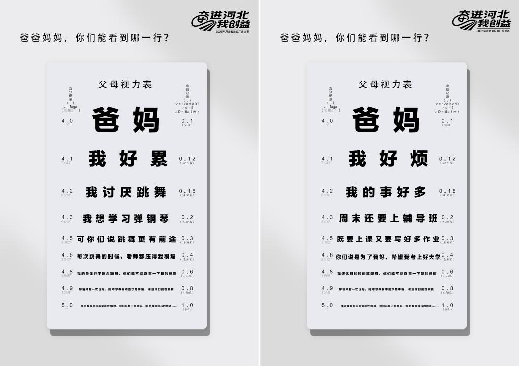 本届大赛以“奋进河北我创益”为主题,面向全社会广泛征集兼具专业性、思想性、文化性和艺术性的优秀公益广告作品,聚焦“爱党爱国,强国有我”“美丽河北,双争有我”“高质量发展,建功有我”“珍惜水资源,节水有我”等四大方向,设置平面类、文案类、视频类、音频类、互动类等五大类别。大赛鼓励使用多种形式进行公益创意表达,坚持守正创新,紧扣时代脉搏,为精神文明建设持续注入活力。文法系王晶同学凭借扎实的艺术功底、深厚的专业素养、卓越的创意才能一人斩获18个奖项。王晶同学的作品主题多元,种类丰富,形式各异。《听完孩子的话》以独特的切入角度、新颖的展现手法、细腻的情感表达荣获平面类一等奖,它采用“父母视力表”的创意形式,将儿童心理健康诉求转化为“心理视力表”的视觉语言,检测亲子间对心理信号的感知度,呼吁家长关注儿童心理“视力”,感知孩子情绪需求。《剪纸绘农勤,惜栗承美德》等4部作品荣获平面类三等奖,《餐桌上的污染》等7部作品和《万物生,华夏兴》等6部作品分别荣获平面类和文案类优秀奖。